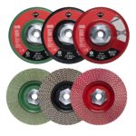 Het assortiment FLAP DISCS (lamellenschijven) wordt speciaal aanbevolen voor het slijpen van keramische tegels, porcellanato, gesinterde steen en natuursteen. Deze bladen zijn sterk aanbevolen voor het slijpen van randen en kleine oppervlakken, dus uitstekend geschikt voor het uitvoeren van verstekken en facetten met de haakse slijper. FLAP DISCS zijn uitgevoerd met een aluminium adapter met M14 koppelschroefdraad, die rechtstreeks op de uitgaande as past van iedere haakse slijper. Deze aluminium adapter zorgt voor minder trillingen en een betere stabiliteit tijdens het werk. Het gamma FLAP DISCS is beschikbaar in 3 verschillende korrelgroottes om zowel een adequaat slijpproces als de beste eindafwerking te garanderen. De beschikbare korrelgroottes zijn: – #50/60 – Voor het eerste en meer agressieve opruwen. – #100/120 – Voor het medium opruwen. – #200 – Voor de perfecte afwerking. De maximale aanbevolen gebruikssnelheid is 10.500 rpm.